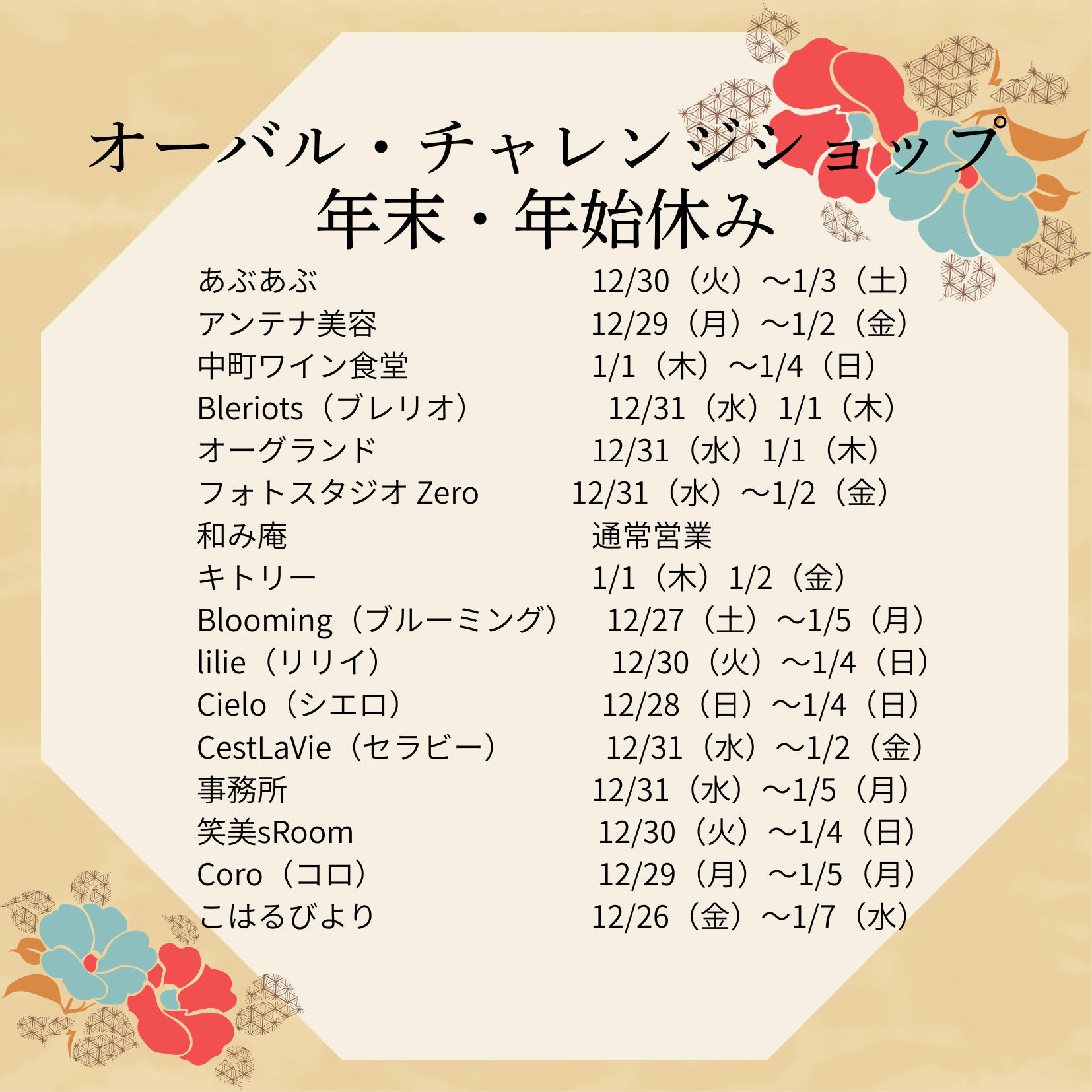 オーバルパティオ年末年始のお知らせ